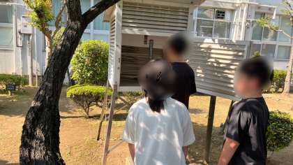 理科の学習です。朝の気温を記録するため、百葉箱の中の気温計を確認していました。