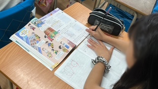算数の学習です。教科書の絵と簡単な説明文を見て何算を使ったら課題が解決するかを考えていました。単なる計算ではなくて、実際の場面で習った計算式を応用できるよう練習していました。