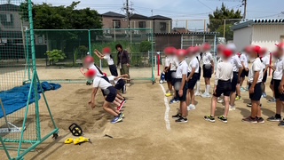 中段は2組、体力テストの立ち幅跳びの練習をしていました。テストの受け方や遠くへ跳ぶコツなどについて説明を受け練習していました。