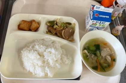 今日の献立は、ホイコウロー、中華スープ、厚揚げのピリ辛醤油かけ、ご飯、牛乳です。いただきます。