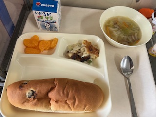 今日の献立は、マカロニグラタン、ウィンナーとキャベツのスープ、みかん(缶)、レーズンパン、牛乳でした。ごちそうさまでした。