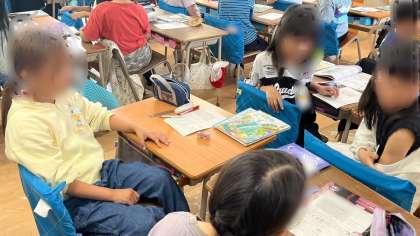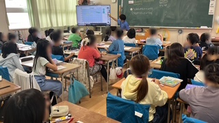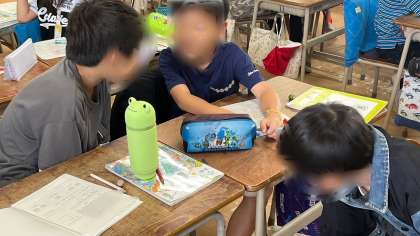 算数の学習です。折れ線グラフの学習で、数値と線の傾き具合との関係を友だちと意見交流しながら考えていました。