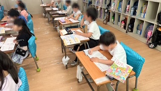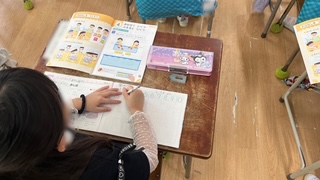 算数で「あわせていくつ」の学習です。水槽に男の子が金魚を3匹、女の子が2匹入れている絵を見て水槽の中の金魚の数を考えます。3と2を「あわせて」がポイントで、足し算につながっていきます。ノートも今日から使い始めました。