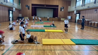 体育の学習で、マット運動をしていました。前転2回転から後転する合わせ技の練習をしていました。
