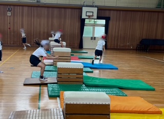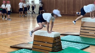 体育で、跳び箱運動の学習です。みんなで協力して場の設定をして、開脚跳びの練習をしていました。自分の課題にあった高さで頑張っていました。