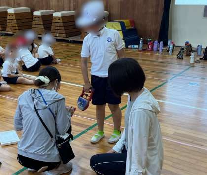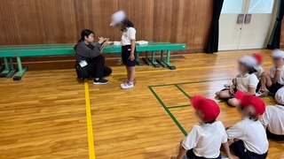 体育の学習で、3学級合同で体力テストをしていました。握力と長座体前屈の計測をしていました。