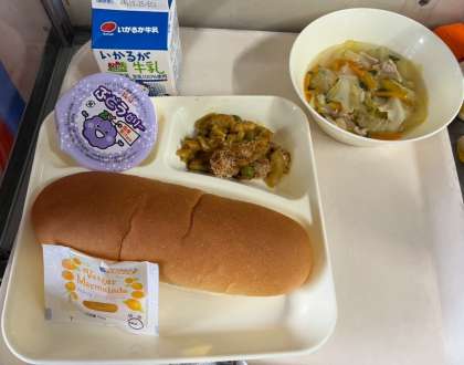 今日の献立は、カレーマカロニグラタン、てぼ豆のスープ、ぶどうゼリー、コッペパン、マーマレード、牛乳です。いただきます。