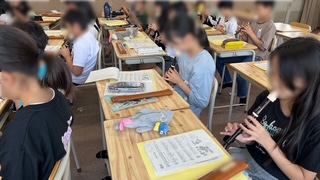 音楽の学習です。リコーダー吹奏の練習をしていました。曲の中には「サザエさん」があって、子どもたちは楽しそうに吹奏していました。