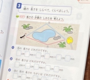 算数の学習です。「ありさんにどっちに行ったらいいか教えてあげよう。」という課題で、青色の行き方と赤色の行き方を比べる方法を考えていました。あちこちで近くの友だちと意見交換している様子がありました。