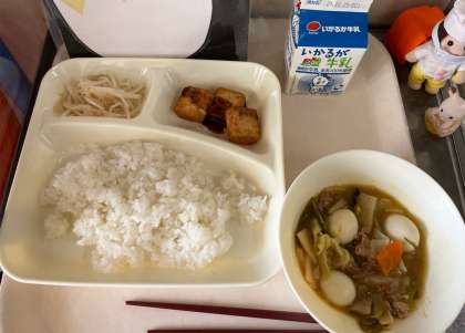 今日の献立は、八宝菜、厚揚げの中華味噌だれかけ、もやしの中華和え、ご飯、牛乳です。いただきます。