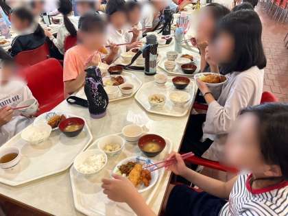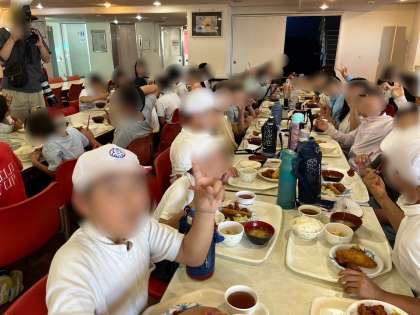 一行は、夕食をいただいています。いっぱい動いて楽しんだので、お腹はぺこぺこです。おかわりする子もたくさんいました。