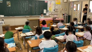 国語の学習で、「聞いたことを伝えよう」という課題です。廊下で先生から聞いたことを前でみんなに伝えます。正確に伝えられるよう頑張っていました。
