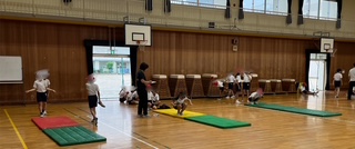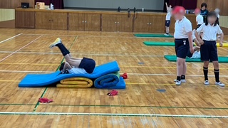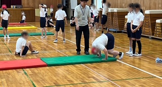 体育の学習でマット運動をしていました。前転→開脚前転→後転の合わせ技を練習していました。先生から技のポイントを教えてもらったり、工夫した場を設定して練習したりしていました。