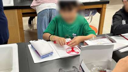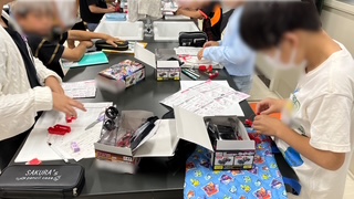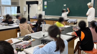 理科の学習です。電流のはたらきの学習で回路について考えていました。電池とモーターを繋いで回路をつくるときに大切なことについて学び、キットを使って確かめていました。