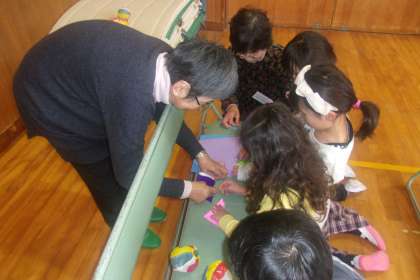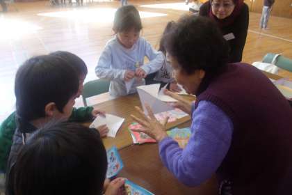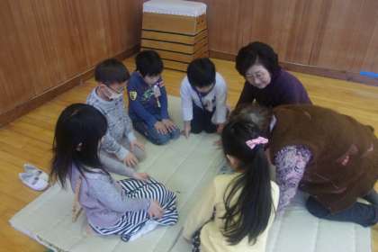 今日は、地域の老人会の方にお越しいただき1年生が昔の遊びを教えていただきました。子どもたちは、ほとんどが初めて見る遊びで最初は難しそうな顔で遊んでいましたが、すぐに慣れて友だちや地域の方と楽しそうに遊んでいました。遊び方のコツを習得するのがとても早くて感心しました。ゲーム以外にもおもしろい遊びがあるということを知って、これからも今日覚えたもので遊んでほしいと思います。