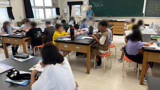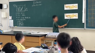 理科の学習です。メダカのオスとメスの身体の特徴の違いについて話し合っていました。背びれや腹びれの違いをよくみてワークシートに図示していました。