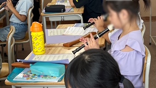 音楽の学習です。音楽記号のおさらいをした後、エーデルワイスの楽譜に階名を書き、リコーダーでの練習に入っていました。
