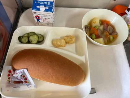 今日の献立は、イカの天ぷら、フレッシュトマトのスープ煮、きゅうりのバジル風味サラダ、コッペパン、いちごジャム、牛乳でした。ごちそうさまでした。