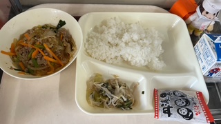 今日の献立は、麻婆春雨、青梗菜ともやしの甘酢和え、いり黒豆、ご飯、牛乳です。いただきます。
