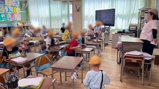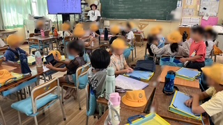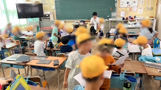 2・3時限目に町たんけんに出かけます。探検に行くにあたっての諸注意を受けていました。