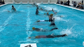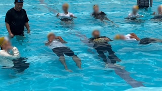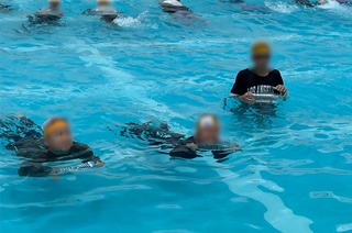 プール水泳学習の様子です。着衣泳をしました。服を着て泳ぐ泳ぎにくさを体験したり、ペットボトルを浮き輪がわりにして顔を水面上に出す練習をしたりしました。