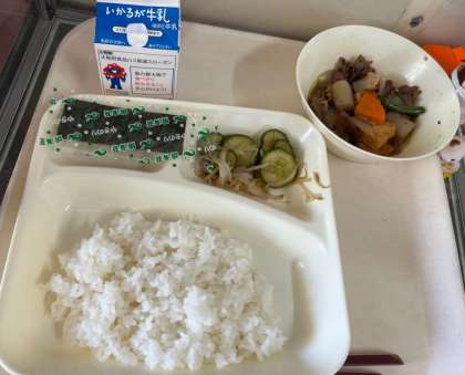 今日の献立は、牛肉と野菜の炒め煮、きゅうりともやしのおひたし、焼き海苔、ご飯、牛乳でした。ごちそうさまでした。