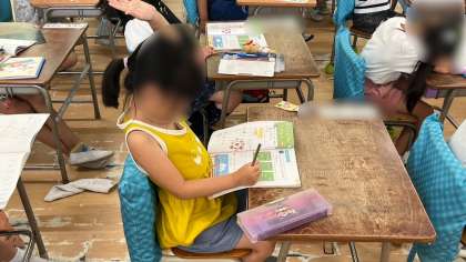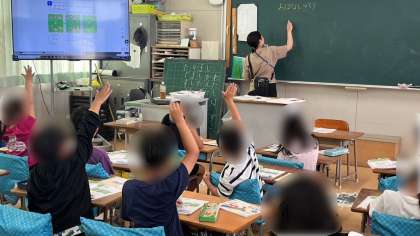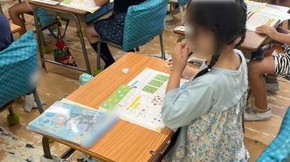 算数の学習です。教科書の挿絵をもとに、引き算の問題になるようにお話をつくります。「公園に◯人遊んでいました。」「◯人帰りました。」「残ったのは何人ですか?」◯に数字を入れて引き算の式を作っていました。