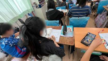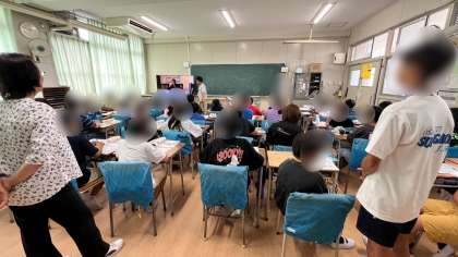 英語の学習です。外国の人が話している映像を観ながら、話している内容を聞き取ってメモしたり話している様子から考えたりして、ワークシートの問題に答えていました。