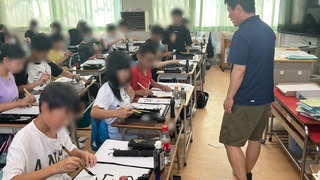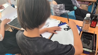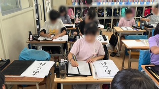 習字の毛筆の学習です。今日は、平仮名「あられ」を練習しました。いい姿勢で丁寧に練習していました。