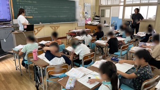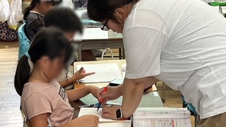 算数の学習です。二桁の数のある足し算の筆算を練習していました。先生が机間巡視をして1人ずつ指導していました。