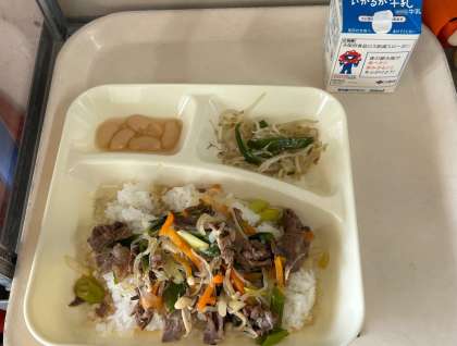 今日の献立は、牛丼、もやしとピーマンの胡麻炒め、大福豆の煮物、牛乳です。いただきます。