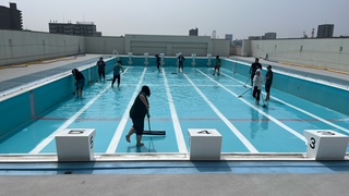 本校のプールは職員で定期的に清掃しています。清潔なプールで子どもたちが活動できるようしっかり清掃しています。