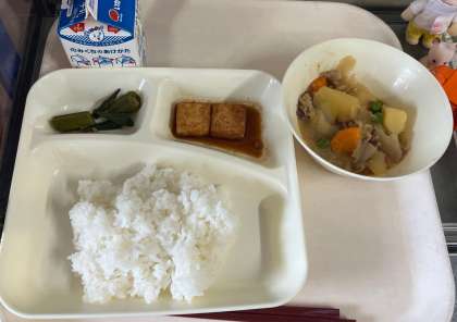 今日の献立は、味噌肉じゃが、厚揚げの生姜醤油かけ、オクラのおかか炒め、ご飯、牛乳です。いただきます。
