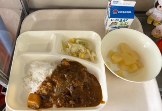 今日の献立は、夏野菜のカレーライス、サワーソテー、洋梨(缶)、牛乳です。いただきます。