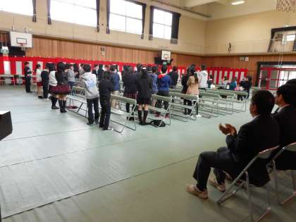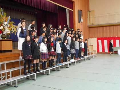本番に体調が悪く出席できなかった児童のために、担任の先生や学年の先生、友だちがもう一度卒業式をしてあげたいという思いから、本日授与式をすることになりました。卒業生は41人も集まり、保護者・教職員も多くの方が出席し、とてもあたたかい雰囲気の式となりました。