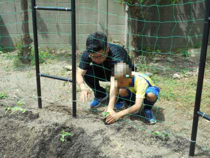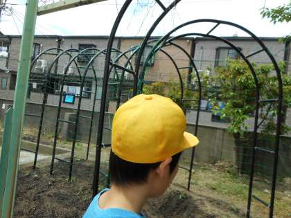 今日は、4年生が教室で大事に育てていたヘチマとヒョウタンを学習園に植え替える作業をしていました。4年生の学習園は普通と少し違っていて、植物のツルが伸びて巻きついていくと、緑のトンネルができるようにアーチ状になっています。どんどん成長して立派な緑のトンネルができたらいいなと思います。
