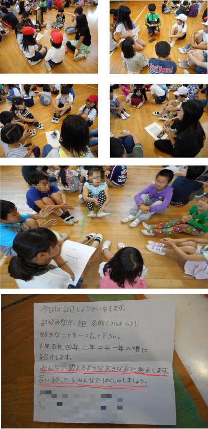 今日のフレンド集会は、1年間色々と共に活動するフレンド班のみんなで自己紹介をしました。班のメンバーで円になり、名前だけでなく「好きな○○」を付け加えて自己紹介をしている班が多く感心しました。まさに生きた表現活動です。6年生の中には、自己紹介の司会をするために話す内容をメモしてきている児童もいて、やる気が伺え頼もしかったです。