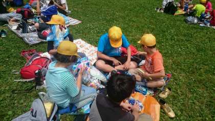 たくさん歩いてお腹が減ったので勢いよく食べ始めた5年生です。他にどこの学校も来ていないので、貸し切り状態です。