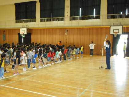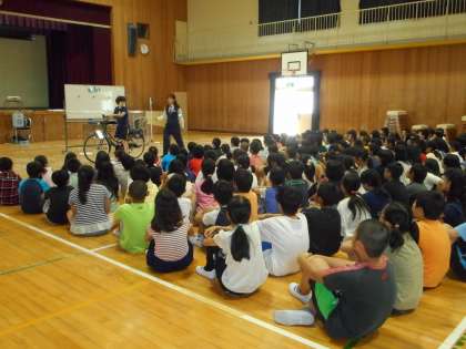 今日は交通安全学習がありました。本来は運動場で実施する予定でしたが、雨で状態がよくなかったため全学年講堂で行いました。住吉警察署の方にお越しいただき、低学年は「正しい歩行の仕方」、中・高学年は「正しい自転車の乗り方」を教えてもらいました。