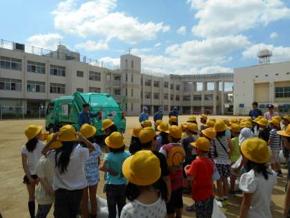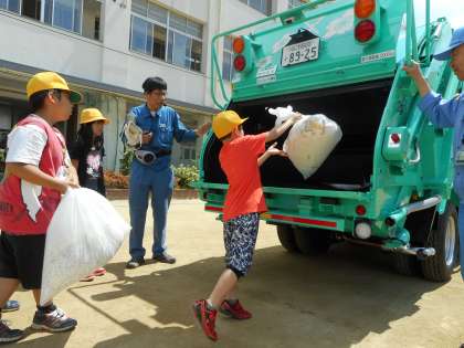 パッカー車の仕組みを教えてもらって実際にゴミを入れる体験をしたり、大阪市のゴミの歴史を学んだりしました。4年生の中で、「パッカー車の色が何種類かあるのは意味があるんですか?」と質問した児童がいました。日頃からよく見ているんだなぁと感心しました。答えはご存知でしょうか??