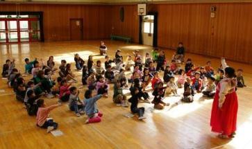 2年生は、11月12日にゲストティチャーを招いて、おとなりの国である韓国・朝鮮の文化や遊びを学びました。あいさつの言葉やじゃんけんの仕方、いろいろな楽器や民族衣装などを教えていただきました。最後に、ペンイ(コマ)などの遊びを体験しました。
