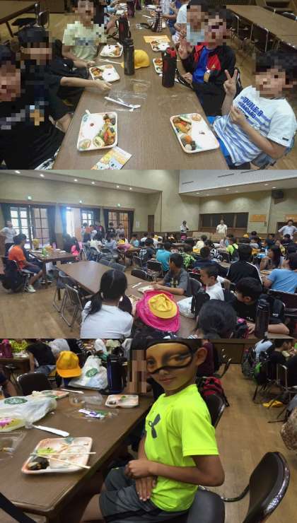 お弁当タイムです☆暑いので室内で食べています。食べて少し休憩したら、大阪に向けて出発です。