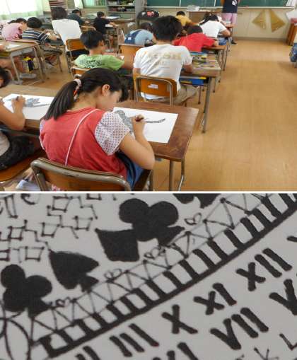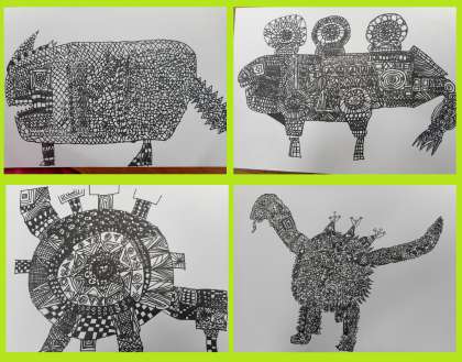 5年生の教室をのぞくと何やら画用紙にネームペンで恐竜を描いていました。しかし、よく見てみるとただ単に描いているだけではなくて、記号やマークだけで恐竜の絵を描いていました。敷き詰めながら描くのでどんどん思っているのと形が変わっていく様子が面白かったです。素晴らしい作品をどうぞご覧下さい。