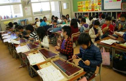 3年音楽「旋律の特徴を感じとろう」という単元で、『ゆかいな木琴』という曲を学習しました。旋律の特徴を感じとるために、歌唱したり、手拍子でリズムを確認したりしました。その後に、鍵盤ハーモニカ1,鍵盤ハーモニカ2,木琴,リコーダー,タンブリン,カスタネットのパートに分かれて練習しました。パートごとに教え合ったり、一緒に練習したりしながら、上手に演奏することができるようになってきました。最後に、クラス全員が心を合わせて合奏しました。合奏の様子をビデオ撮影して、その映像を見ました。自分たちで合奏の様子を振り返り、お互いに良かったところやアドバイスなどを伝え合うことができました。みんな音楽を本当に楽しむことができた1時間の学習でした。