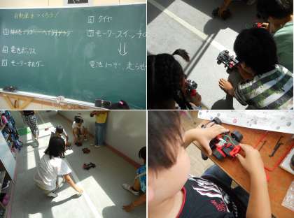 4年生の教室?廊下?ではモーターカーを走らせている児童がいました。のぞいてみると、理科で「電気のはたらき」の学習をしていました。乾電池のつなぎ方や数と電気の強さの学習です。それで、モーターカーを使って楽しみながら学習をしていたということでした。内容はしっかりと頭に入ったかな??