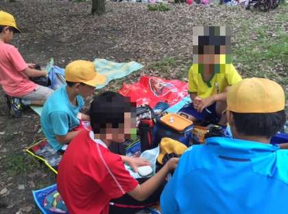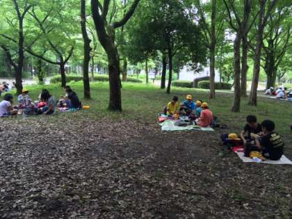 お弁当タイムです。雨も降っていないので、大阪城公園で食べています!今日は比較的涼しくてよかったです!