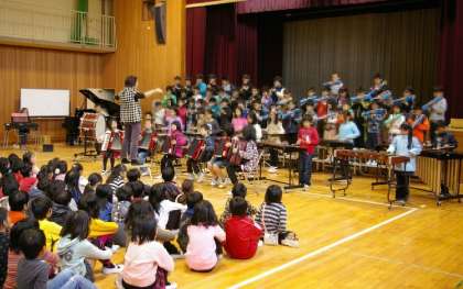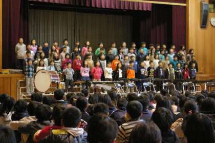 本日のフレンド集会は、「がんばって集会」を実施しました。11月22日(金)の住吉区交歓音楽会に本校を代表して参加する4年生の合唱と合奏を聴き、激励する集会が「がんばって集会」です。全校児童の前で、4年生が合唱「きらめく風」、合奏「ホールニューワールド」の2曲を発表しました。合唱では、きれいな歌声で心をこめて歌い講堂に響かせていました。合奏でも、自分の演奏する楽器だけを鳴らすのではなく、友だちの演奏をしっかりと聴きながら心を一つにして、演奏していました。練習当初は、自分のことだけを考えて歌い演奏していましたが、徐々に、合わせる、響かせることに気づいたり、放課後や昼休みに自主的に練習に取り組んだりすることで、見違えるほど上手になっていました。交歓音楽会でもすばらしい合唱・演奏を披露してくれると思います。その演奏を聴いている1〜6年生のみんなも音楽の世界に引き込まれ、静かに集中して聴くことができました。