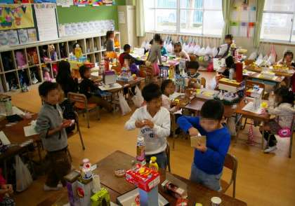 1年生の教室をのぞくと、たくさんの箱を使って何かを作っていました。どうやら展示会にむけて工作をしているようです。どんな作品ができるか楽しみですね。