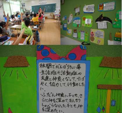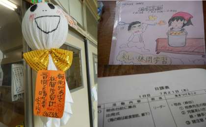また、教室の背面掲示には図工で作ったホワイトボードにそれぞれが、林間学習のめあてを書いて掲示していたり林間の時は晴れますようにと願いを込めたBIGてるてる坊主がつるされていたりと本当に林間一色です。