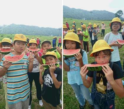 スイカを堪能した後は、高原から宿舎がある大久保まで自然を観察しながら下りていきます!景色はきれいですが、この道のりがまたきついです。がんばれ子どもたち!がんばれ先生たち!